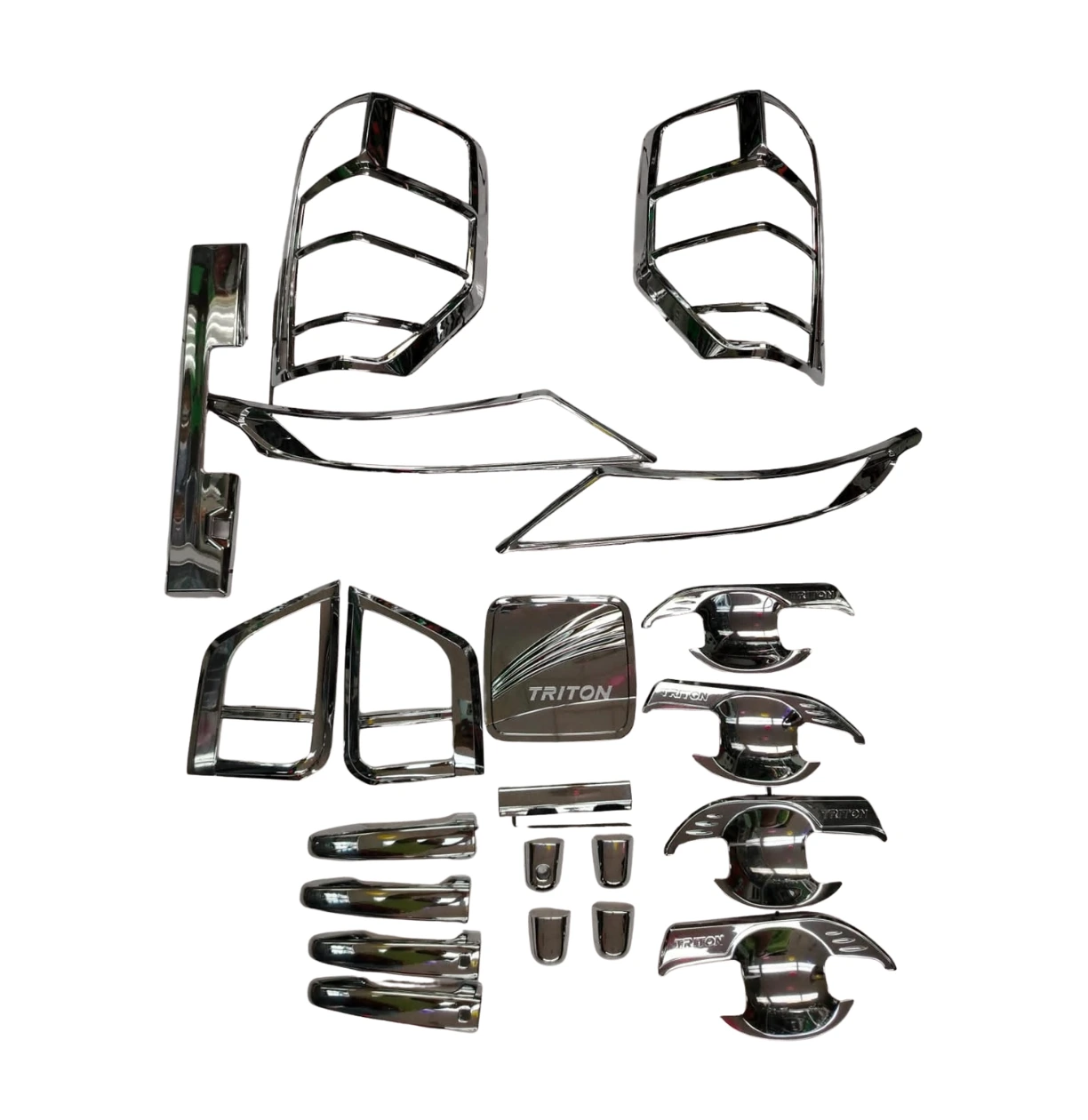 Combo completo de accesorios decorativos cromados diseñado específicamente para la Mitsubishi L200 / Triton (Modelo «Cara Nueva» 2019 en adelante). Fabricado en plástico ABS con triple recubrimiento de cromo espejo. Incluye molduras para faros, stops, manijas, conchas y tapa de combustible. Instalación adhesiva sencilla con cinta 3M pre-instalada.