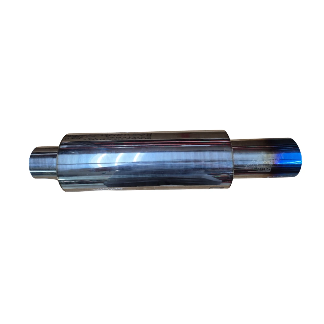 Silenciador de alto flujo tipo «Cañón» (N1 Style) marca HKS. Fabricado en acero inoxidable SUS304 con acabado pulido espejo y punta de salida estilo titanio quemado (Tornasol/Azul). Entrada de 3 pulgadas (76mm) para máximo rendimiento. Genera un sonido deportivo grave y profundo. Diseño universal soldable.